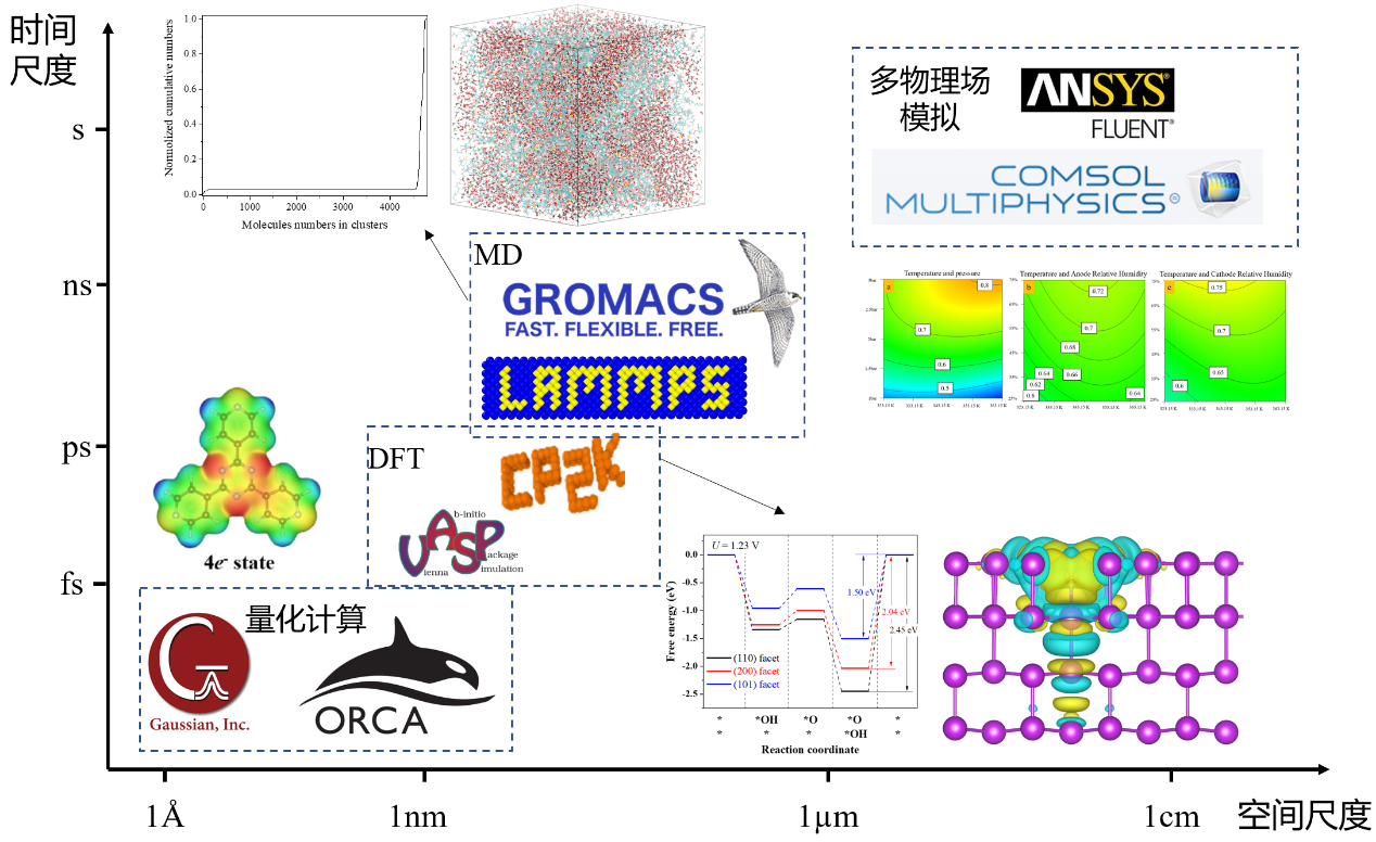 (3)多尺度电解水过程模拟:整合全电子结构分析、第一性原理(DFT)计算、全原子与粗粒化分子动力学(MD)模拟及多物理场耦合模拟技术,构建从原子到系统的全尺度模拟平台,揭示电解水关键界面过程与传递机制。